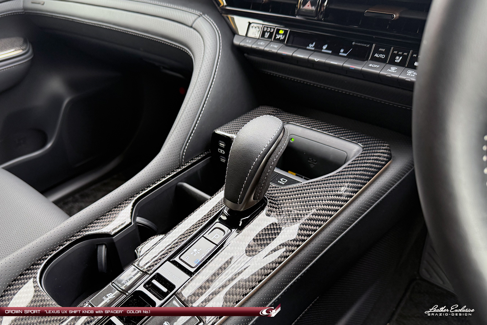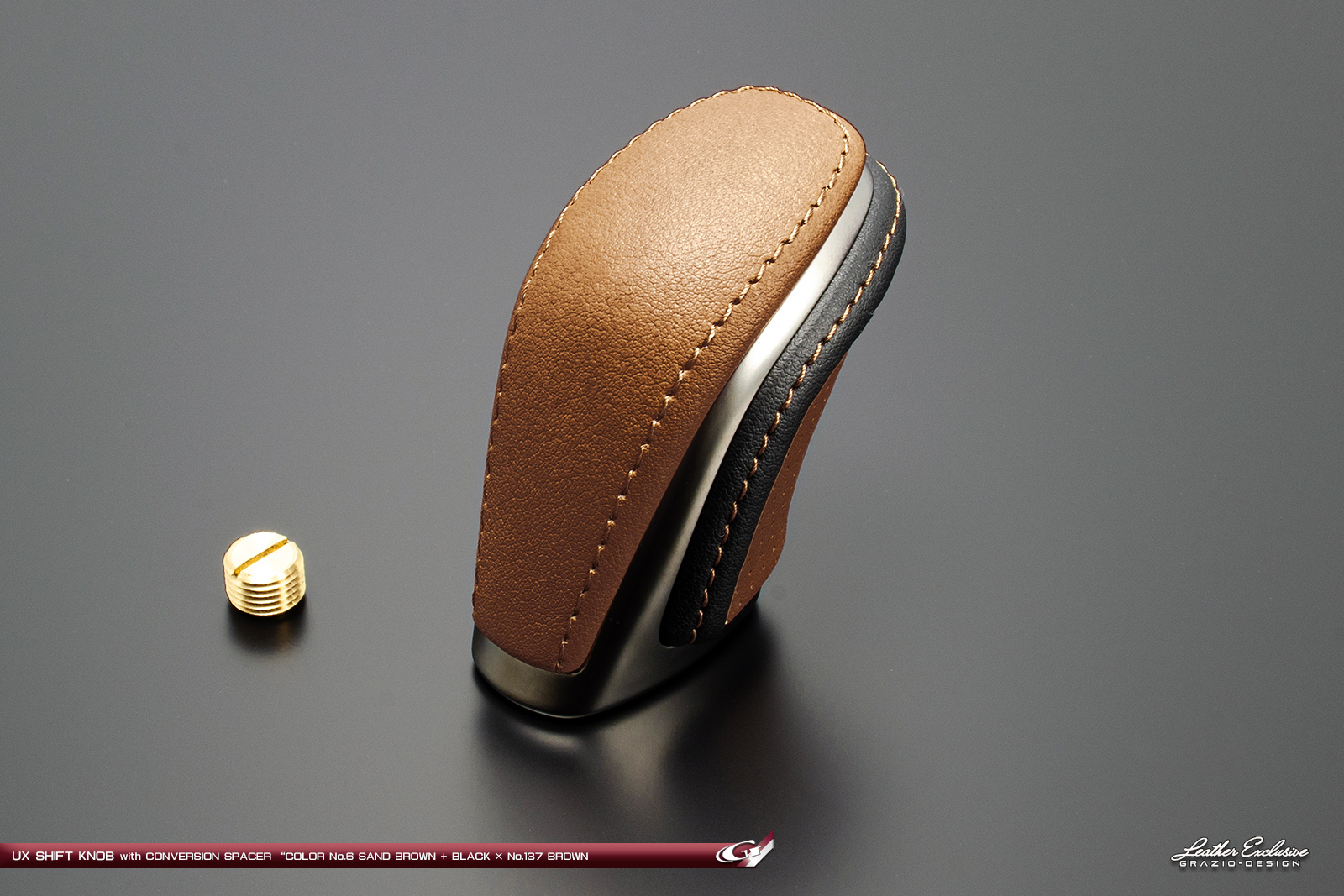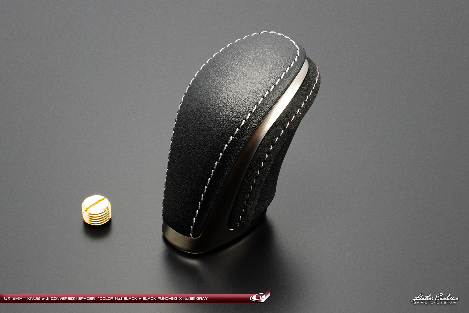 | レクサスUX300eの純正採用がLCと形状を共有する事を受け、それ以外の電気式AT 採用モデルでも流用にてお愉しみ頂けるプログラム。付属の専用スペーサーを併用 して頂く事で純正然に装着して頂けます。(専用取付説明書付属) 天面のパートと背面のパートそれぞれにステッチワークを採用、その境界線には重 厚感と華やかさを感じる金属調を贅沢にあしらう仕様となります。天面の落ち着き あるスムースレザーに対して背面にはスポーティなパンチングレザーを併用、1つ のシフトノブを巡り多くの要素を盛り込んだ意匠をお愉しみ下さい。 |