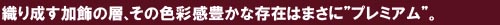 | 光の透過を巧みに利用した、複数色の”層”によって形成されるのが 「プレミアムオパール」という左の加飾です。レクサスHYBRID車に 標準採用される、サイドのドアモールバッヂにインスパイアされたこの 色彩は、何色という定義付けが極めて困難な複雑な色調変化が最大 の特徴です。紺色にも群青色にも濃い紫にも感じられる不思議なヴィ ジュアルをお楽しみ下さい。 |