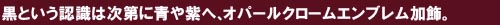 | 別名ブルーイッシュブラック。時にブラック、時にブルーやパープルの ように見える絶妙の色彩感が最大の特徴。ブラッククロームが限りなく グレースケールでの濃淡変化であることに対し、色調=カラーリング での変化という別の一面もお楽しみ頂ける加飾となります。黒系ボディ と白系ボディで全く異なる装着イメージになるのも大きな特徴となります。 |