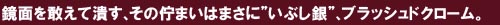 | 鏡面、あるいは光の反射といった要素と間逆を行く、孤高のラグジュアリー を表現するのが”ブラッシュドクローム”。あえて煌びやかな質感ではなく、 鍛え上げられたいぶし銀を連想させる独特なフラットクリアが、リアル ユーロコンセプトを再現致します。時間の経過と共にその渋みがじわりと 効いてくる、独自の存在感を併せ持ちます。 |