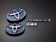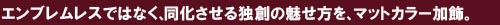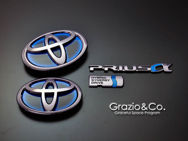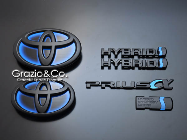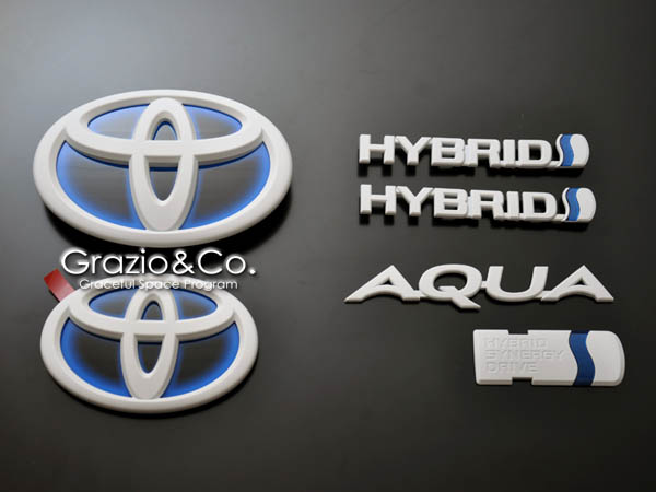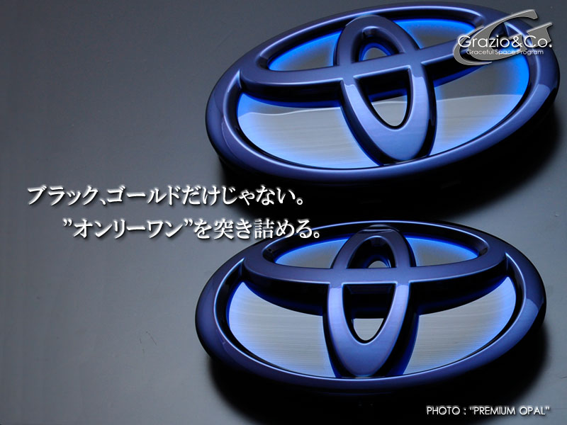 | 先にご紹介のブラッシュドクロームとは、また一味異なる手法で光沢を 消す手法”マッドブラック&ホワイト加飾”。近年のトヨタ純正エンブレム はほぼ例外なく樹脂成型のものをクロームメッキ処理によって完成させ、 その素材感を徹底排除する完成度の高さが魅力ですが、敢えて機械質 で無機質な独創の存在感が魅力の加飾メニューとなります。 エンブレム表面に敢えてごく僅かな凹凸を残してフィニッシュするのがGrazio の特徴でもあります。 |
