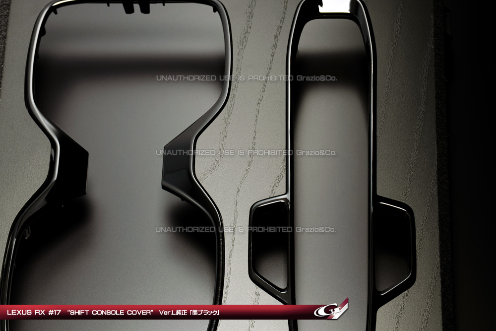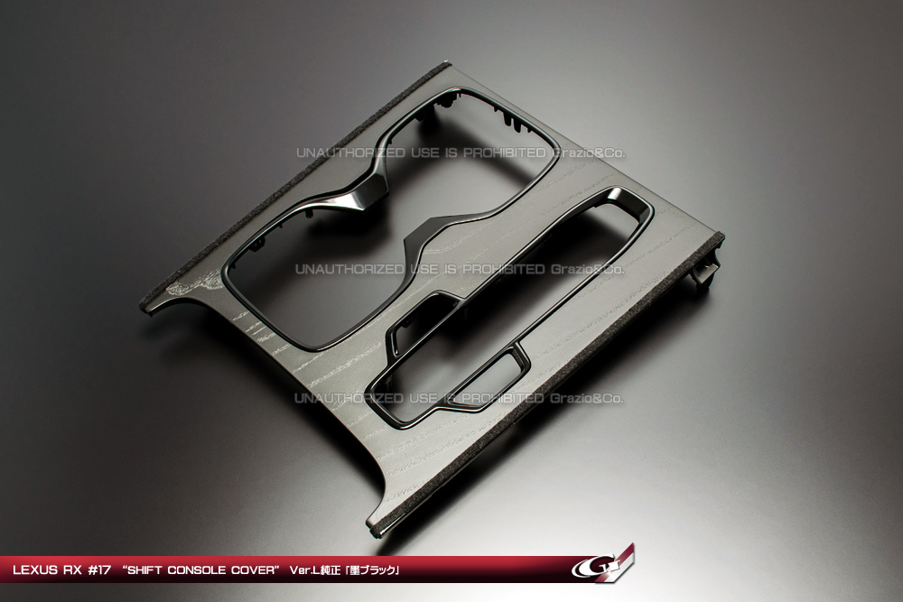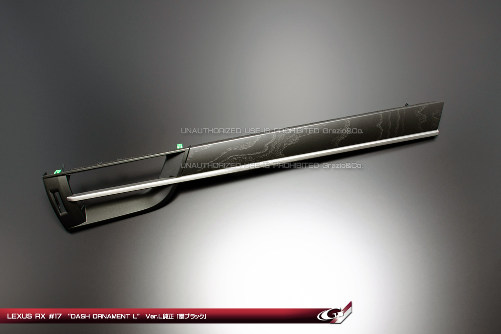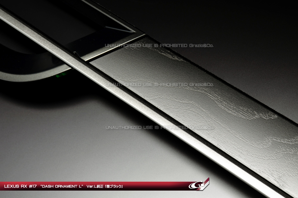 | 500h及び350の「F SPORT」オーナー様へ向けて純正流用のご提案となる室内 各所のオーナメントパネル。F SPORTでは標準でダークスピンアルミと呼ばれる ヘアライン基調のトリムが1種類であることを受けて、Ver.Lからのフィードバッ クによりアルミのシルバー基調とはまた異なる雰囲気をお愉しみ頂く狙いのご提 案となります。 |